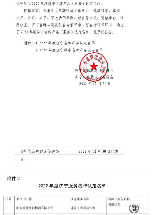 好事成雙,捷報頻傳,近日,濟寧市品牌建設促進會公布了2022年度濟寧名牌產品(服務)認定名單?!安┠軝z測”順利入選,被評為2022年度濟寧名牌產品。